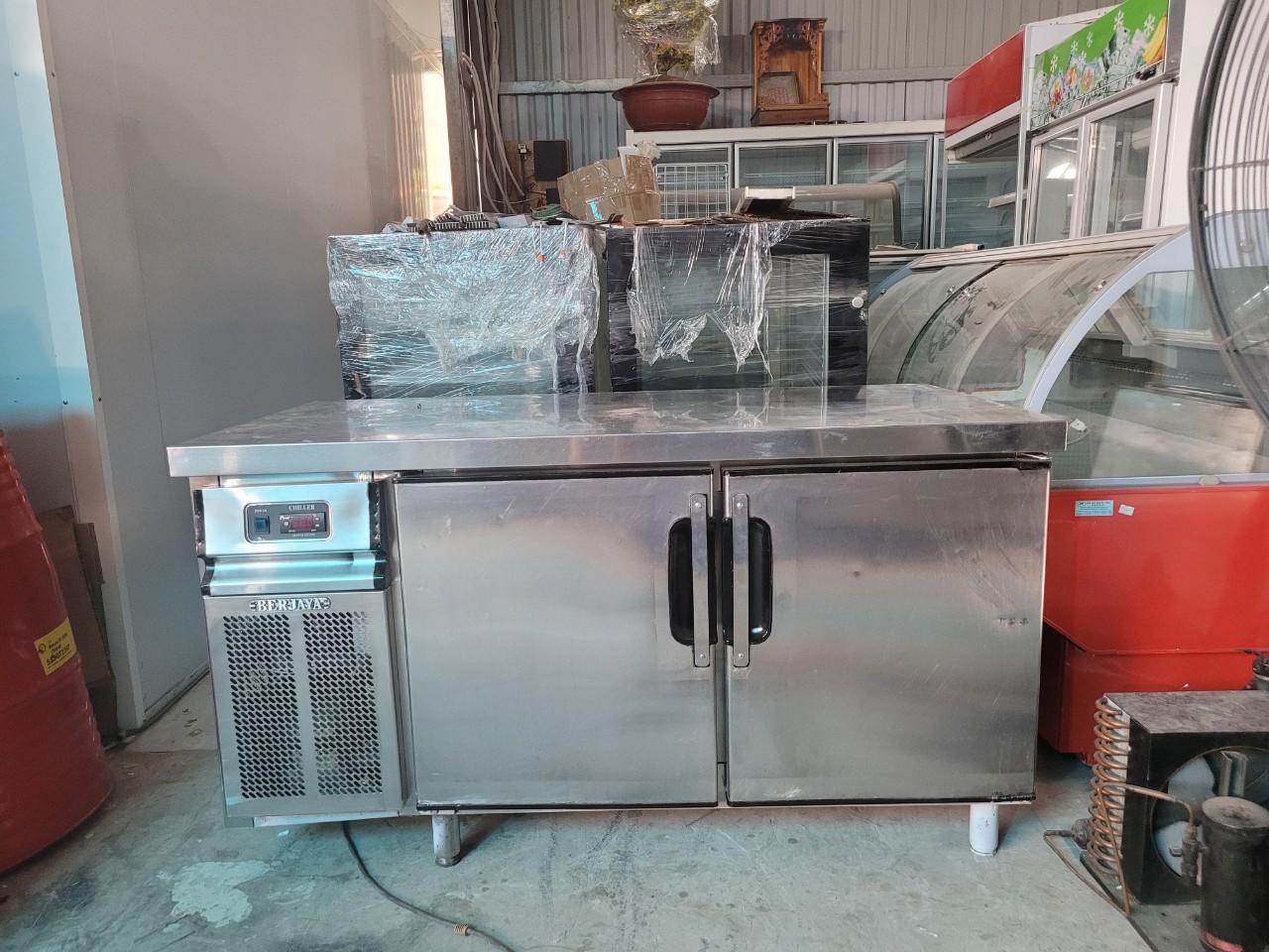 Bàn mát 1.5M Berjaya , mới 88%, tiện dụng 2 cánh mở ra , quạt gió , bên trong chứa thực phẩm, phía trên mặt bàn dùng làm bàn sơ chế, bàn ra đồ, pha chế đồ uống, bảo quản thực phẩm .